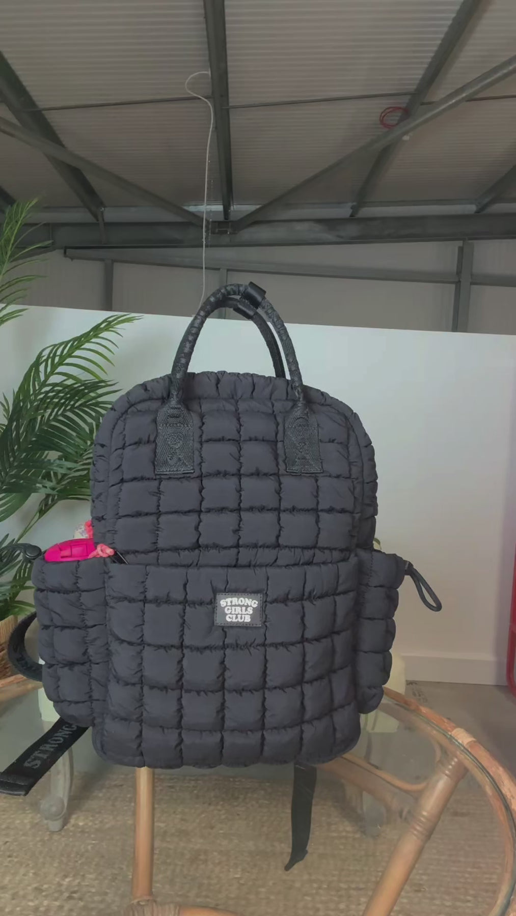 The Dumpling Quilted Black Backpack combines style and sustainability with its recycled materials and soft, padded design. Its squishy texture offers comfort while multiple pockets, including side compartments for your water bottle and an internal padded laptop sleeve, keep your essentials organised and protected throughout your day.