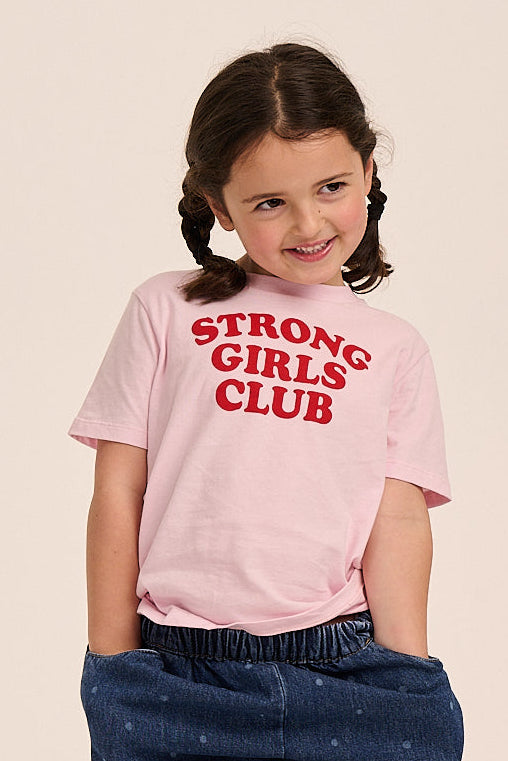 • Iconic Strong Girls Club logo printed using eco-friendly inks in red.