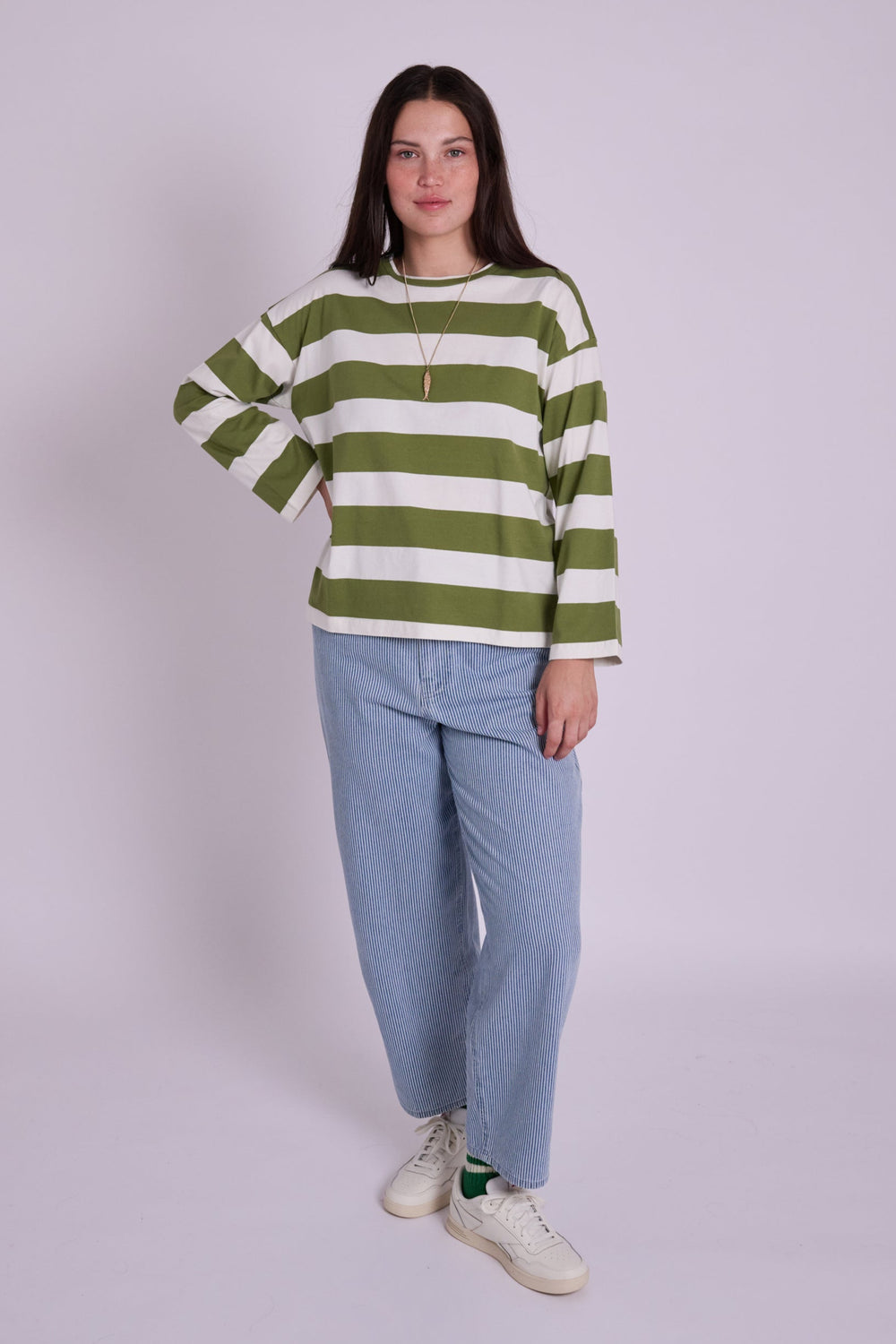 The Eline Olive Green Wide Stripe TShirt is the perfect heavy weight boxy long sleeved Tshirt to add to your wardrobe in a wide stripe combination that's perfect for late summer and early Autumn. A relaxed fit with dropped shoulders she looks great with your Ottie Trousers.